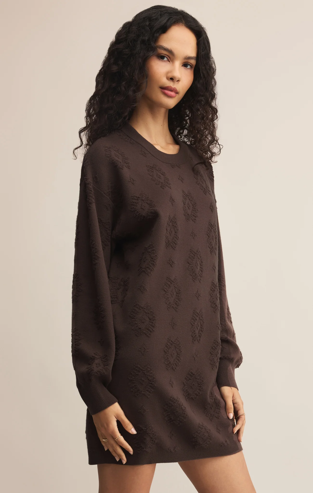 This jacquard mini dress combines the comfort of cozy yarns with an elevated textured knit. Its long sleeves and easy silhouette make it a go-to for dressing up or down.