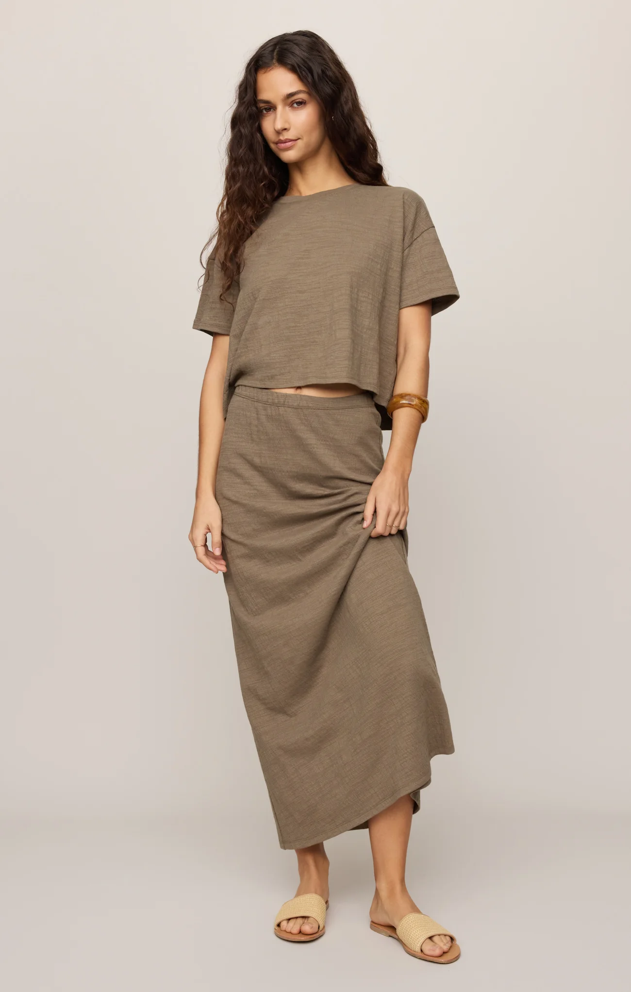Made from our textured slub knit, this midi skirt offers a softly structured feel with just the right amount of stretch. The pull-on waistband and flowy length make it an easy choice for dressed-up comfort.