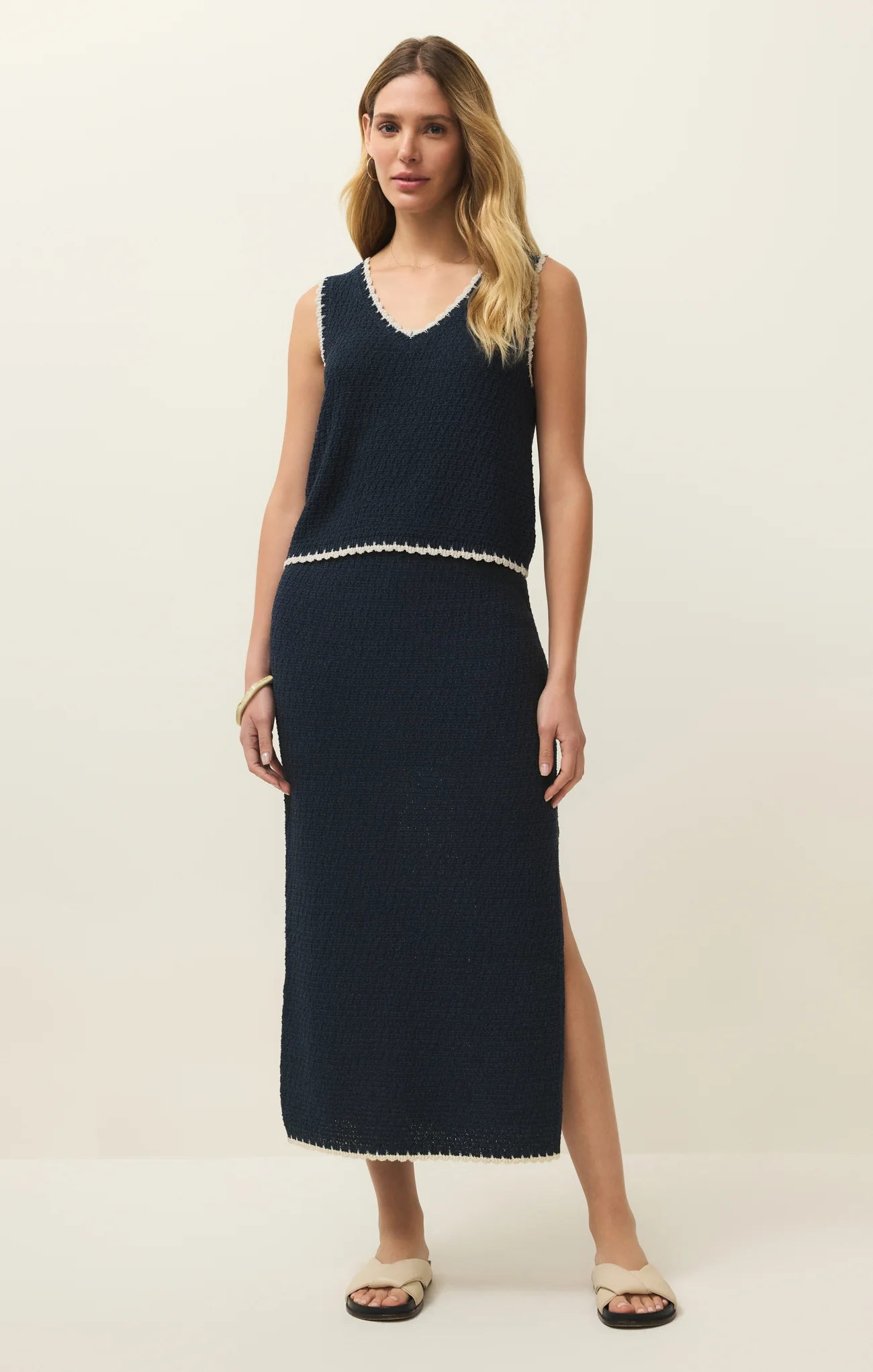 This sleeveless tank stands out with contrast color trim, yarn blend fabric, and a flattering relaxed silhouette. Make it a set with the Yessenia Whipstitch Skirt.